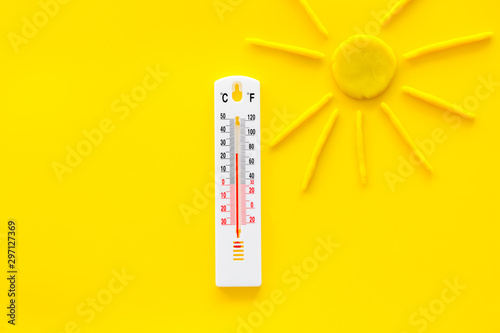 Sunny weather concept. Sun and thermometer on yellow background top view copy space