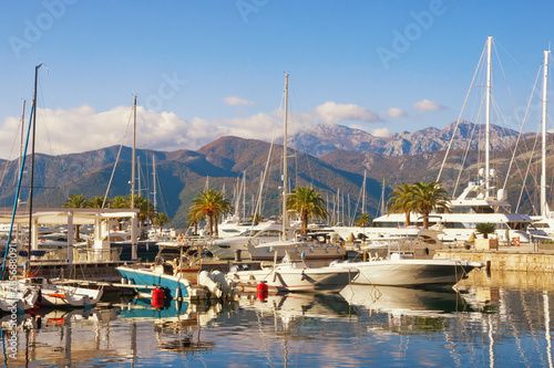 Sunny winter day in yacht marina of Porto Montenegro. Montenegro, Tivat city, Kotor Bay of Adriatic Sea