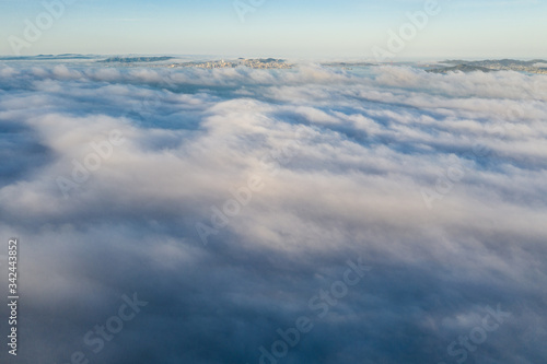 Sunrise illuminates the marine layer covering the entirety of San Francisco Bay. The foggy marine layer is a climatic phenomenon that is an almost daily occurrence in this region.
