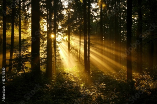 Sunrise in a misty forest