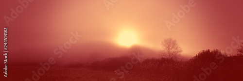 Sunrise in the morning in a hilly area, meadow landscape countryside. Web banner for design.