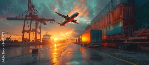 Sunrise Logistics: Cargo Plane, Container Truck, and Cranes at Shipyard Representing Export Operations