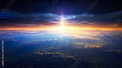 sunrise or sunset over planet Earth, clouds and atmosphere in rays of Sun, open space and stratosphere