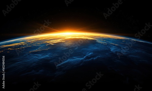 Sunrise over Earth from space revealing glowing atmosphere and illuminated continents against dark starry background