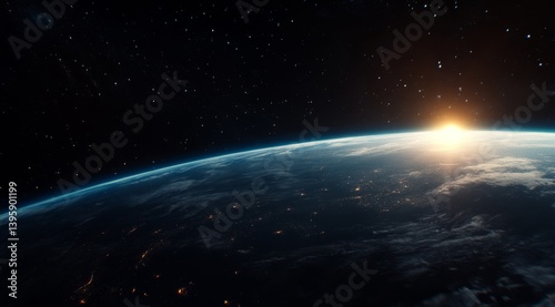 Sunrise over Earth from space, showing city lights and atmospheric details.