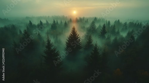 Sunrise over misty forest, aerial view, autumn