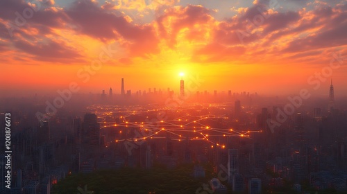 Sunset Cityscape Illuminated Network Connections