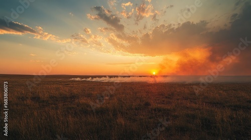 Sunset Fire Landscape with Smoke Over Golden Grass Plains