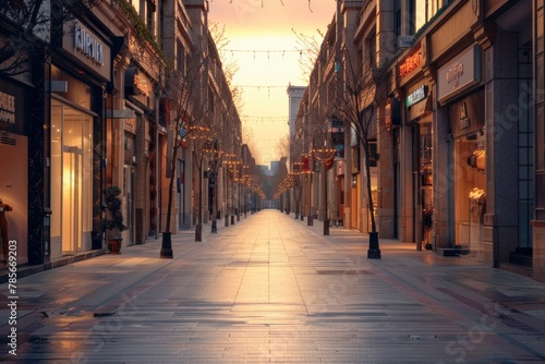 Sunset Glow on Empty City Street with Festive Lights and Elegant Shops