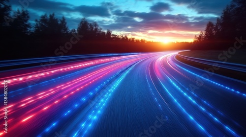 Sunset highway speed, vibrant digital trails, forest backdrop