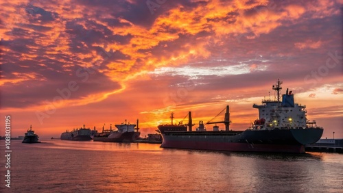 Sunset illuminates a fleet of freighters at berth showcasing their commitment to ecofriendly shipping practices.