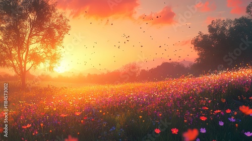Sunset in a field of wildflowers, warm colors and soft lighting