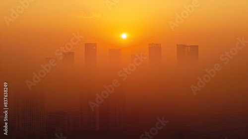 Sunset in the Smog: Capture the sun setting behind a skyline obscured by smog, creating a dramatic and ominous scene that highlights the impact of pollution on the environment.
