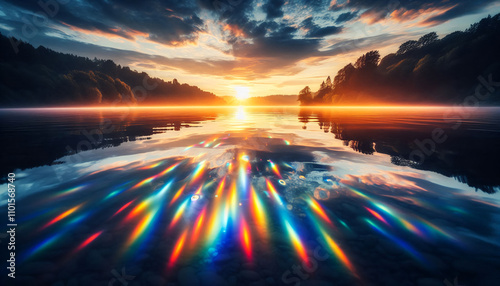 Sunset light casting rainbow streaks across a still lake, with colorful light aberrations reflecting over the water surface against a serene, natural landscape.