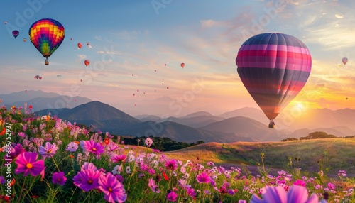 Sunset Magic: Vibrant Cosmos Flowers and Hot Air Balloons in a Field of Dreams