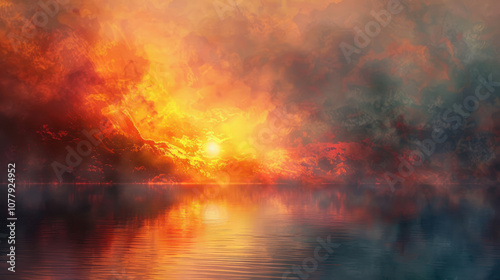 Sunset over a misty lake, the sky ablaze with fiery colors, blending into the peaceful water below