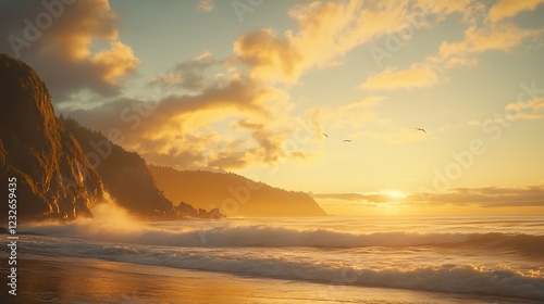 Sunset over a tranquil beach with waves crashing against the rocks and clouds illuminated by warm light.