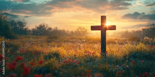 Sunset over a wooden cross surrounded by flowers in a tranquil open field