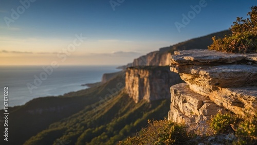Sunset Over the Ocean with Dramatic Cliffs in the Background Wallpaper Background