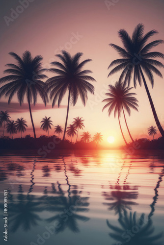 Sunset over the palm trees on an exotic beach, with a colorful sky and reflections in the water.