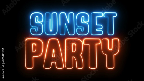 Sunset Party neon sign. Sunset Party text font with neon light. Luminous and shimmering haze inside the letters of the text Sunset Party.