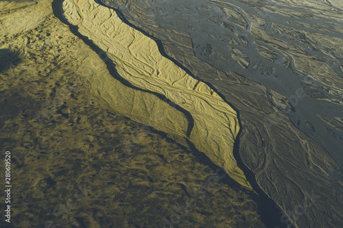 Sunset shadows reaching over dried out glacial rivers near Þakgil, a beautiful mountain area in Southern Iceland. The icecap in the background is Mýrdalsjökull, Icelands 4th largest.