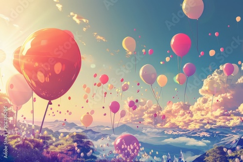 Sunset sky filled with numerous floating balloons, A dreamy landscape of floating birthday balloons, AI generated