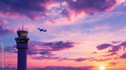 Sunset Sky with Control Tower and Airplane Flying Above Clouds