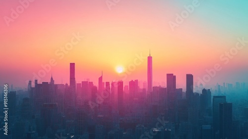 Sunset Skyline with Cityscape in Pink and Blue Hues
