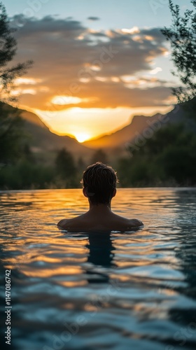 Sunset tranquility with a person relaxing in warm waters surrounded by majestic mountains and soft evening light