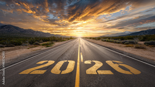 Sunset view over an empty road with 2026 painted on the asphalt in a serene desert landscape