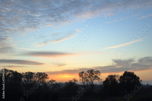 Sunset with trees silhouette, blue sky and gray clouds.