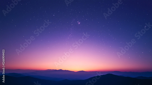 Sunsets blend with stars over serene mountains creating a tranquil twilight atmosphere