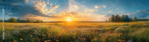 Sunshine breaking through the clouds over a blooming meadow, mixed weather, renewal
