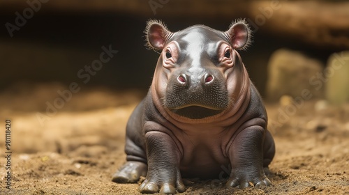 super cute close up portrait of a baby hippopotamus sitting on ground smiling at camera, funny wildlife or zoo vibes