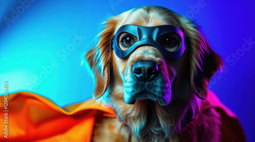 Super hero dog. Golden retriever dressed in a colorful costume with mask and cloak
