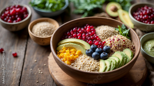 superfood bowl filled with vitamin-enriched ingredients. Include a mix of leafy greens, avocado slices, quinoa, pomegranate seeds, blueberries