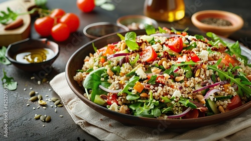 Superfood Salad: Image of salad that is based on grains such as protein from tenderized meats, soybeans, and seeds. Serve with delicious sauce.