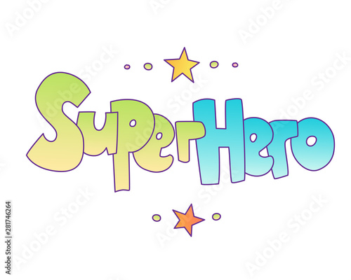 Superhero lettering with gradient colors. Superheroes word, cartoon cute style with decorative elements isolated on wihte background. superpower and super hero lettering