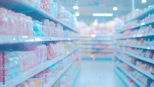 Supermarket aisle with pastel-toned products