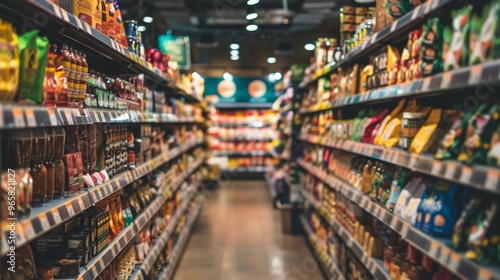 Supermarket aisle with various products on shelves