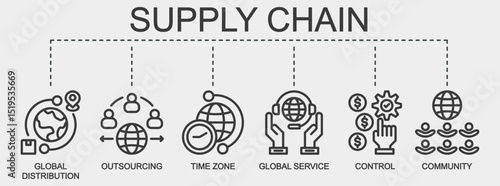 Supply chain banner web icon vector illustration featuring icons of global distribution, outsourcing, time zone, global service, control, and community.