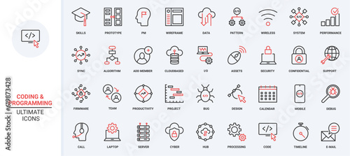 Support for computer software, program code trendy red black thin line icons set vector illustration. Maintenance cloud service, data export, modify synchronisation with server, antivirus programming.