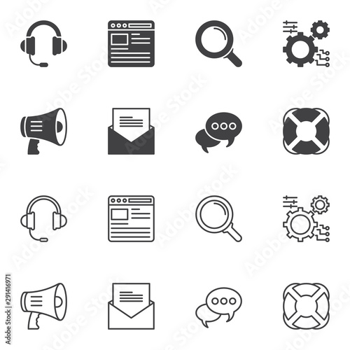 Support icon set line and glyph version, outline and filled vector sign. linear and full pictogram. Symbol, logo illustration. Set includes icons as support headphones, bullhorn, setting gears, email