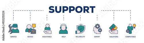 Support icons process structure web banner illustration of service, advice, assistance, help, reliability, expert, solutions and competence icon png transparent background.