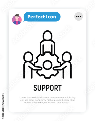 Support thin line icon. Group of people holding big cogwheel by hands. Teamwork, partnership, business cooperation. Modern vector illustration.