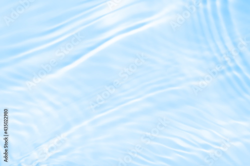 Surface of blue swimming pool. Texture of transparent blue water in swimming pool. Trendy abstract nature background. Water waves in sunlight with copy space