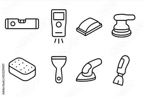 Surface Tool Icons. Line style icons of surface tools: level, laser measure, sanding block, polish tool. grout sponge, scraper