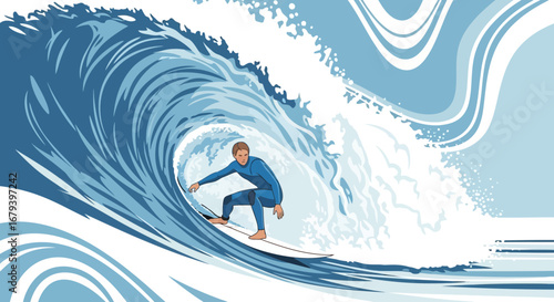 Surfer Riding a Massive Blue Wave in a Stunning, Dynamic Illustration
