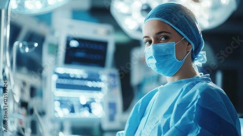 Surgeon in scrubs and a mask preparing for an operation in a high-tech operating room